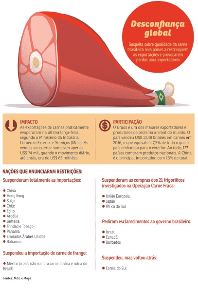Na quarta-feira (22/3), mais cinco países entraram na lista dos que impuseram alguma restrição às carnes brasileiras. O Ministério da Agricultura informou que a África do Sul suspendeu temporariamente as importações dos 21 estabelecimentos investigados na Operação Carne Fraca. Já a Arábia Saudita, maior cliente do frango brasileiro, comunicou que vai suspender as compras dos quatro estabelecimentos frigoríficos suspeitos de irregularidades apontadas na operação.